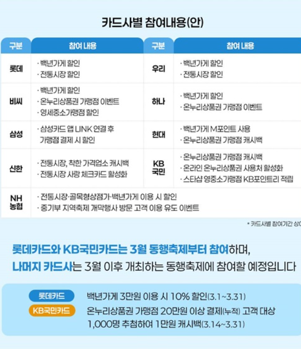 · KB국민카드 : 온누리상품권 가맹점 캐시백, 온라인 온누리상품권 사용처 활성화, 스타샵 영중소가맹점 KB포인트리 적립 · NH농협카드 : 전통시장·골목형상점가·백년가게 이용 시 할인, 중기부 지역축제 개막행사 방문 고객 이용 유도 이벤트