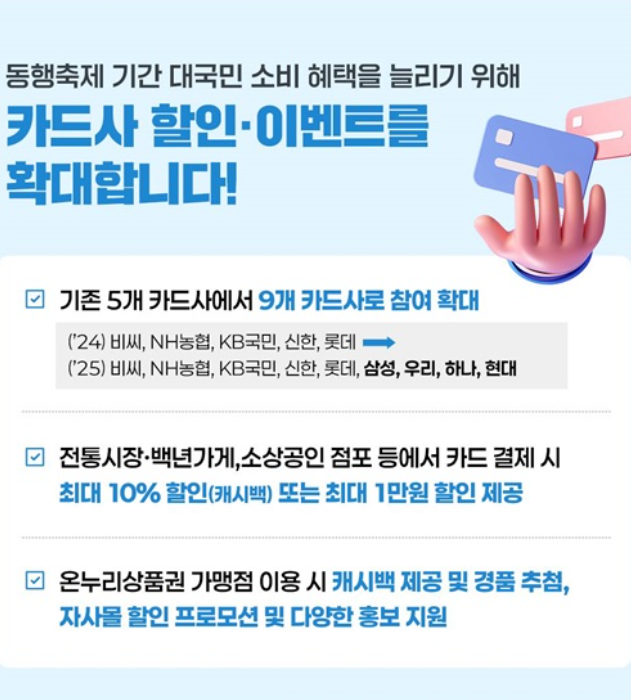 카드사들은 소상공인 점포 및 전통시장에서 카드 결제 시 최대 10% 할인 또는 캐시백을 제공하고, 온누리상품권 가맹점에서 사용할 수 있는 다양한 혜택도 마련했습니다.