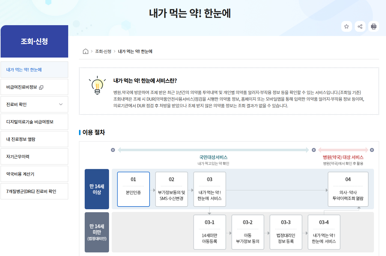최근에는 이 정보를 온라인을 통해 쉽게 열람할 수 있는 서비스를 제공하고 있는데, 그 중 대표적인 것이 "내가 먹는 약! 한눈에" 서비스입니다.