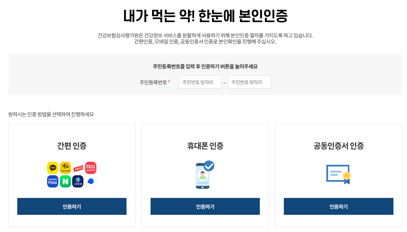 또 다른 방법은 건강보험 심사평가원에서 제공하는 "내가 먹는 약! 한눈에" 서비스입니다.